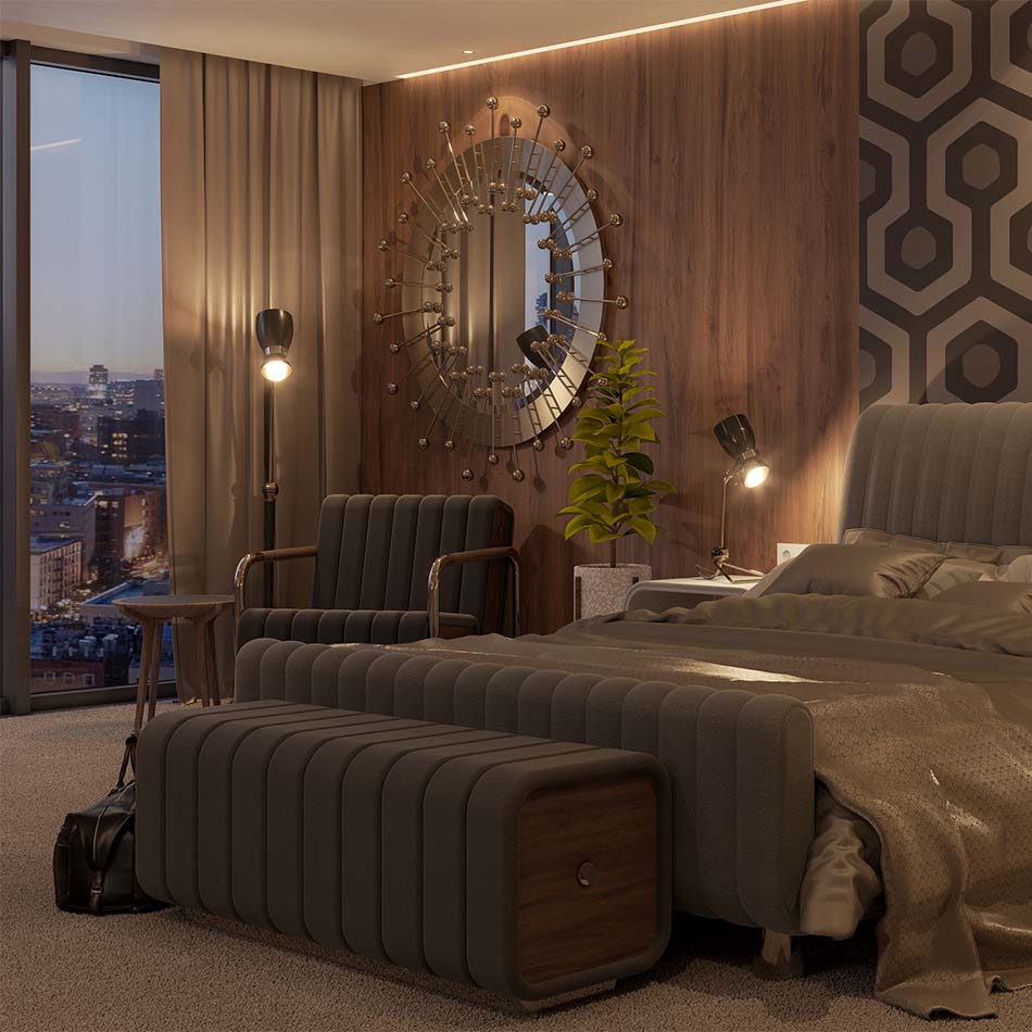Comfortably elongated, a perfect bench for any interior ambience. This curvy bench is upholstered in the finest bonded cloth or velvet, leaving the sides with exposed wood, showing its true nature as a mid-century modern piece. It is very comfortable and an easy way to add more seating and decor to your room at the same time.