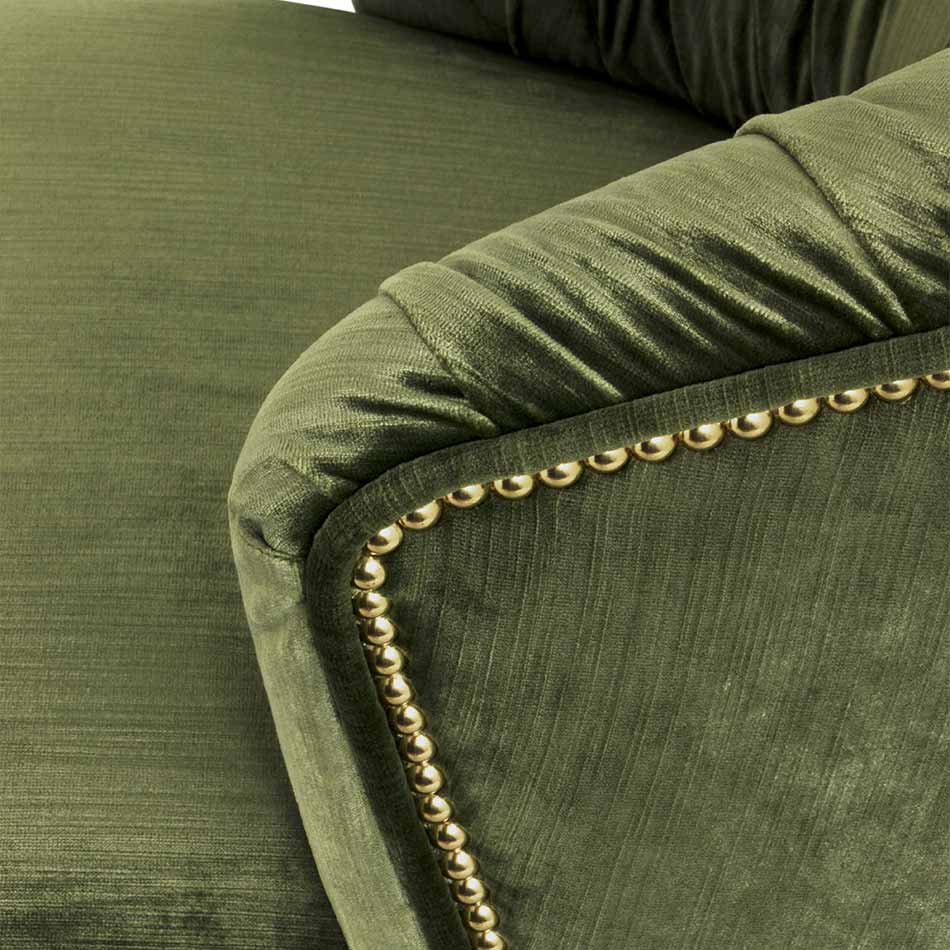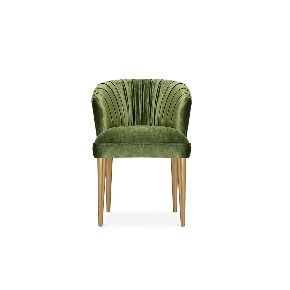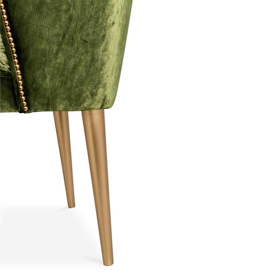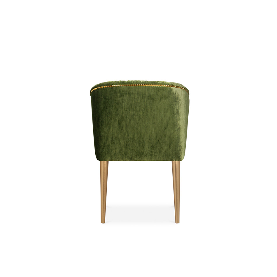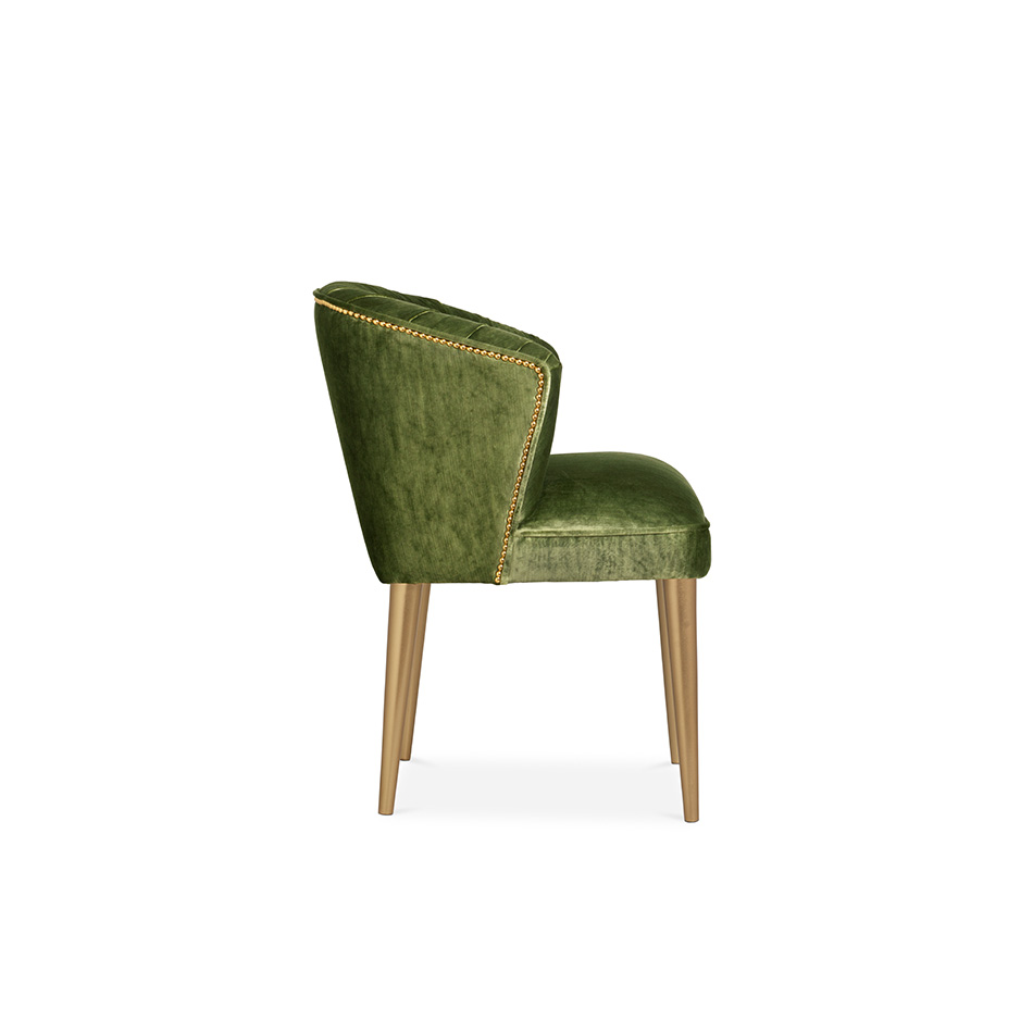 Nuka is a glacier in Alaska known for its sublime beauty. NUKA Dining Chair came to life inspired by this magnificent natural monument. Upholstered in velvet with a nail trim in polished gold, and legs in glossy golden powder, this velvet upholstered dining room chair with a curved back will make any dining room decor look sleek and chic.