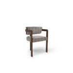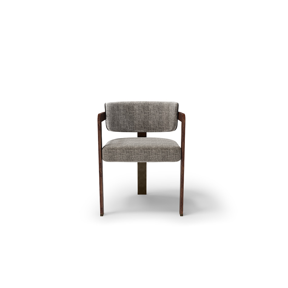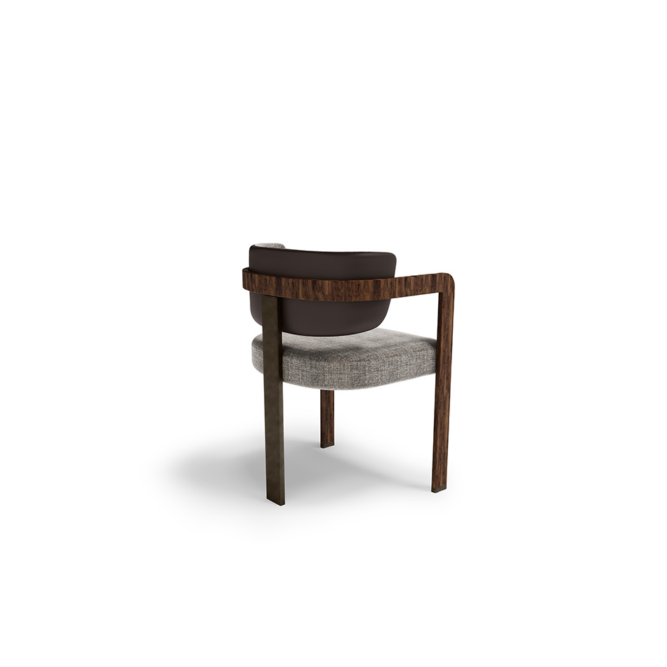 An espresso con Panna means an expresso with cream which is the perfect correlation to the mix of colours and materials present in this minimal contemporary dining chair. The connection of the walnut arm into two legs with the details of stainless steel dark bronze varnish in the third leg elevates a simple chair into a statement piece both in comfort and design. Finally, the cream on top is the softness of the upholstered seating and back, exquisitely ergonomic, being not only for its user but for the eyes as well.
