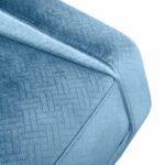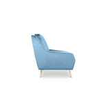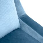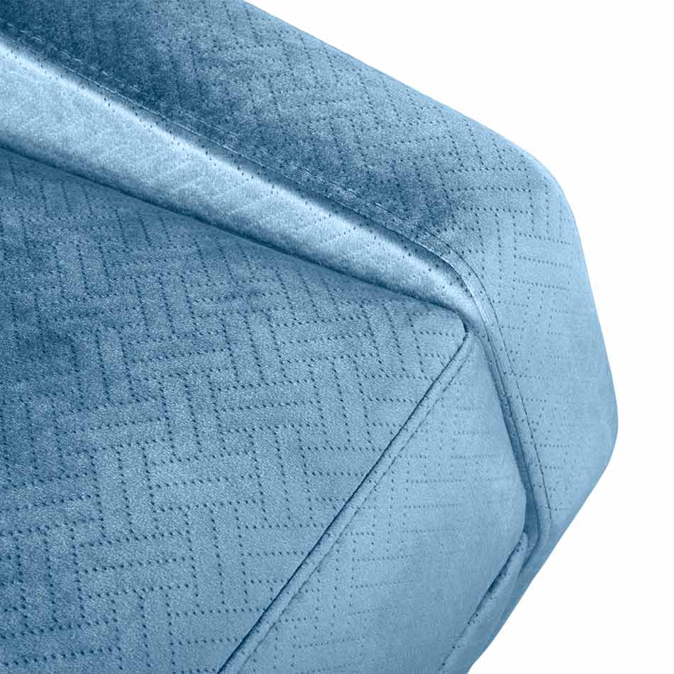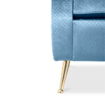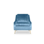 Romero is a lounge chair where the geometric sleek lines merge with comfort. It is inspired by the boldest side of modernism, featuring oblique armrests with a fully upholstered body in high-end fabric. It has a slim leg style made of metal and a small ball foot, providing a sophisticated accent profile to it.