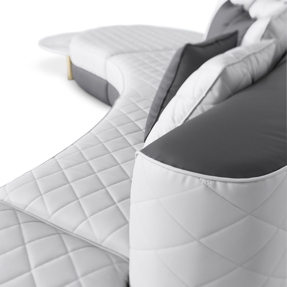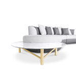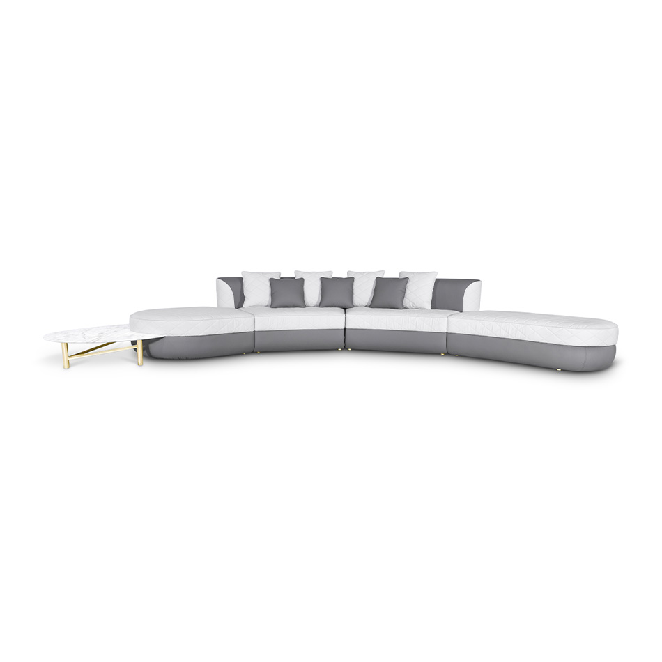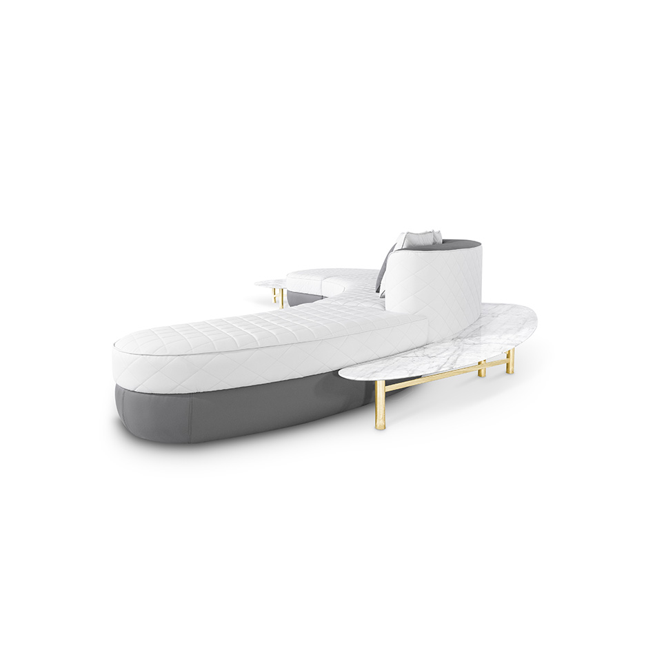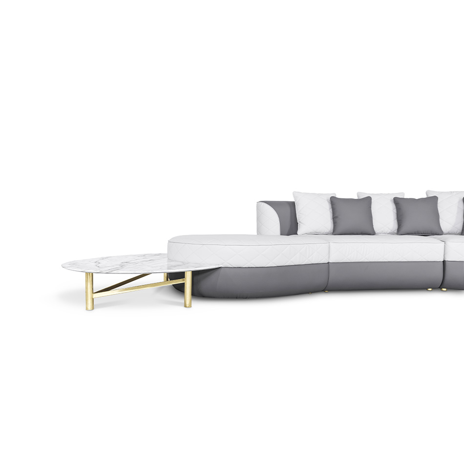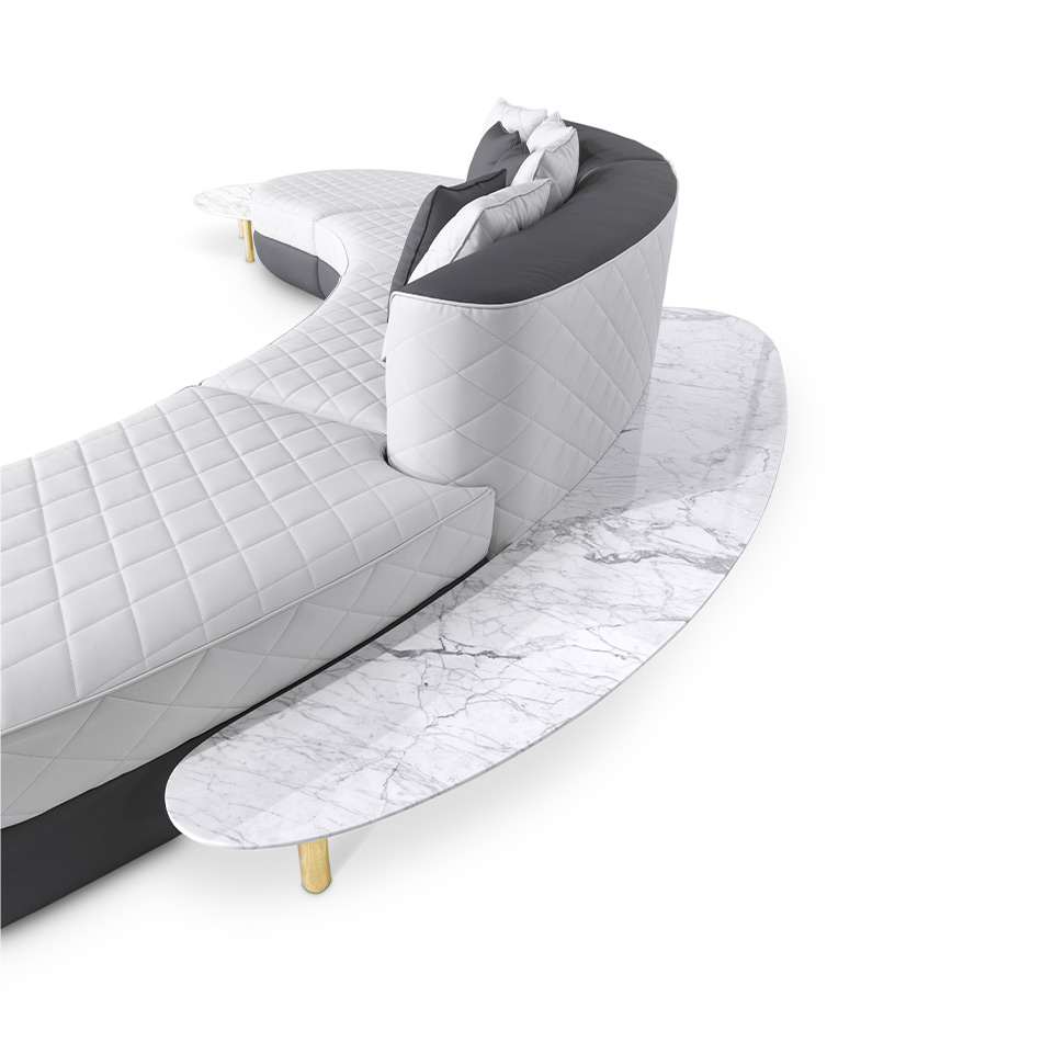 Senzu is a brand-new upholstery piece designed to epitomize the ultimate expression of comfort, functionality, and luxury. This modern sofa made of leather highlights a rounder form with a neutral color scheme. In one of its extremities, Senzu presents an integrated side table completed with a Kenya black marble top and a stainless steel base that grants a new dimension to the concept of the living room sofa.