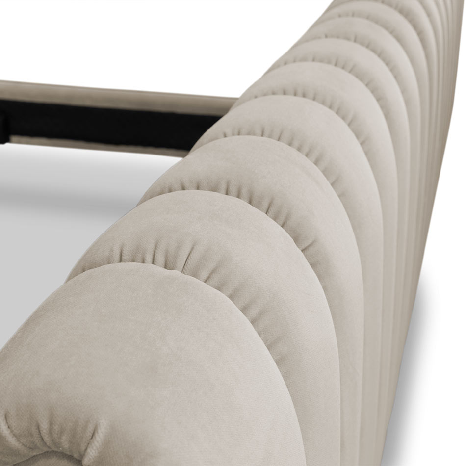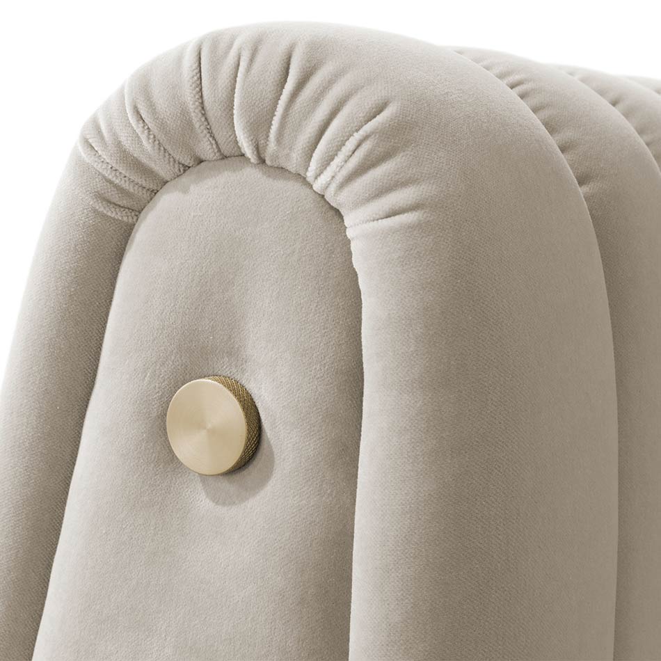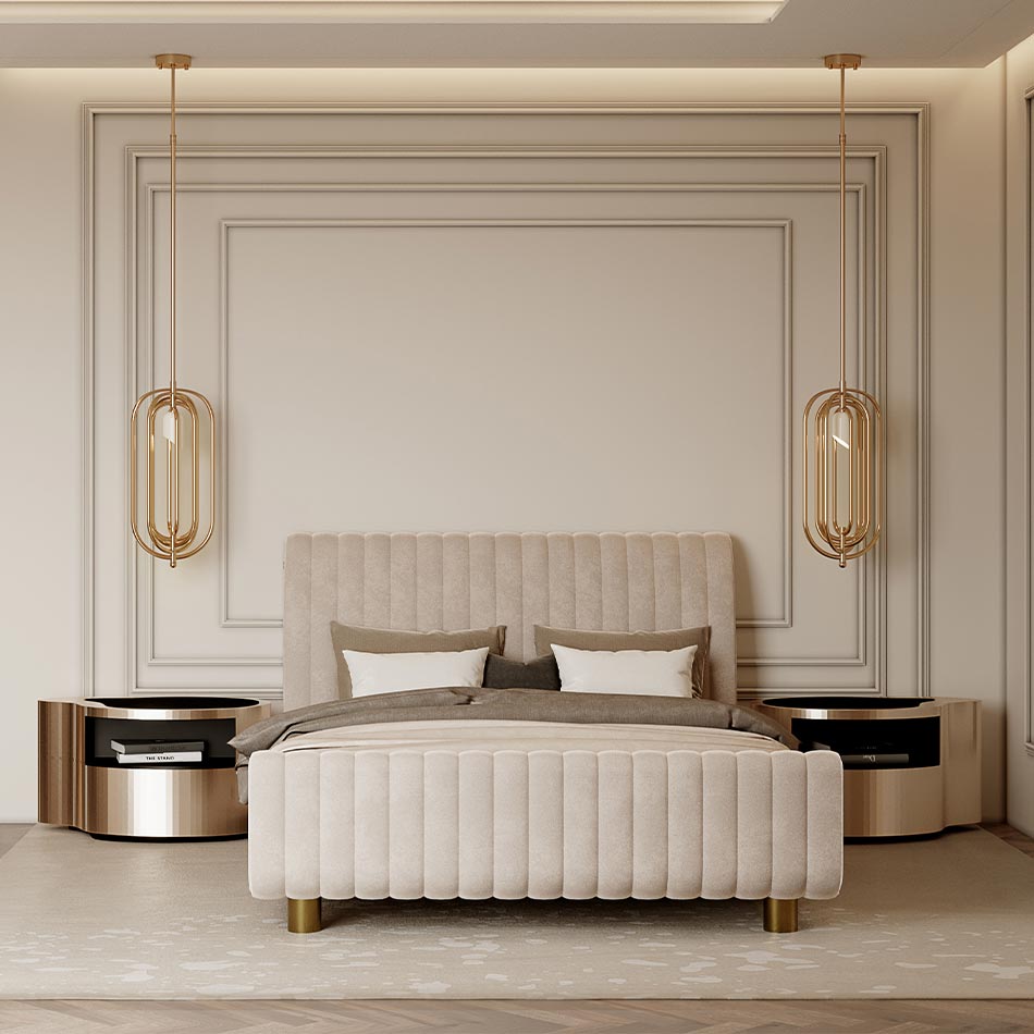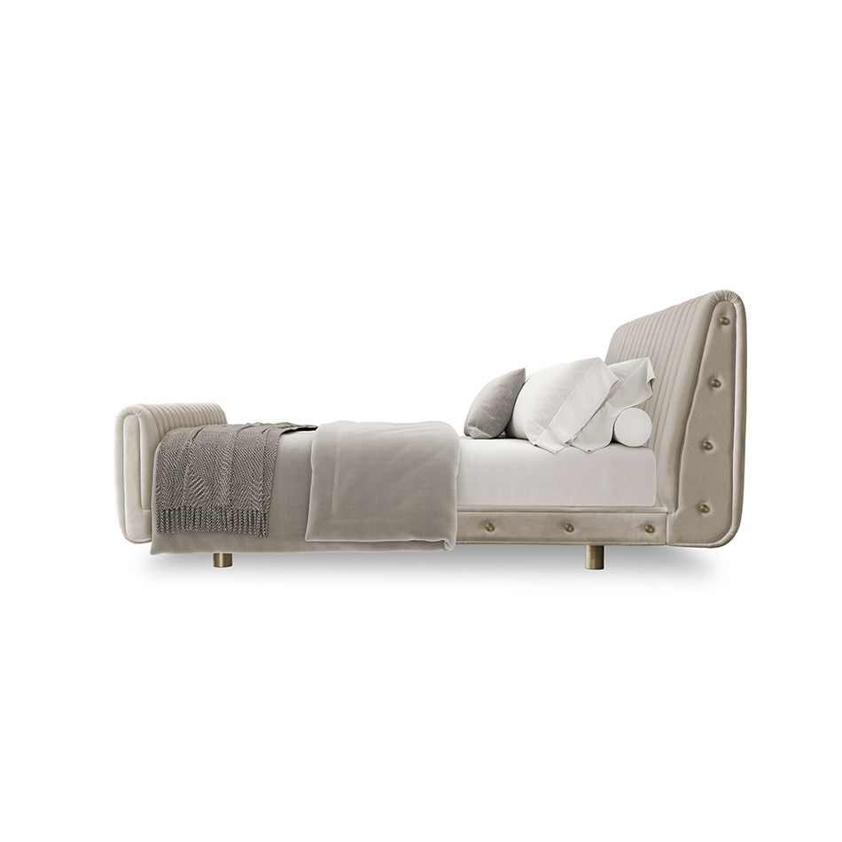 Sophia is a mid-century styled panel bed with bonded velvet on the headboard and footboard, perfect for any bedroom. Expertly stitched from the top to the bottom and accented with tufted metal buttons on both sides, proving high quality stunning details. It features legs also made of metal, turning this bed into an inspiring retro furniture piece.