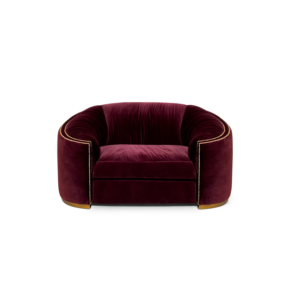 Often called the “Land of Castles”, Wales has some of the most impressive monuments of the Middle Ages. WALES Single Sofa pays tribute to the country’s history. Upholstered in cotton velvet and with a base in matte vintage brass, this curved velvet single sofa features a golden polished nailhead trim that makes it even more elegant.