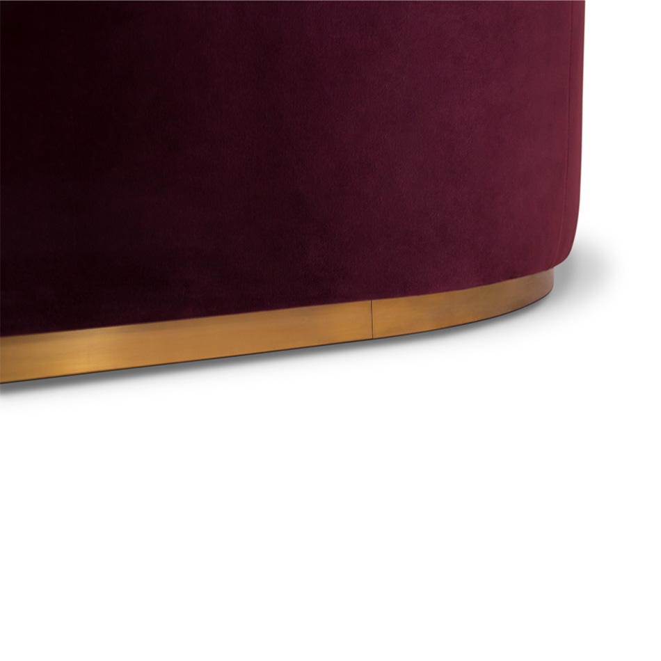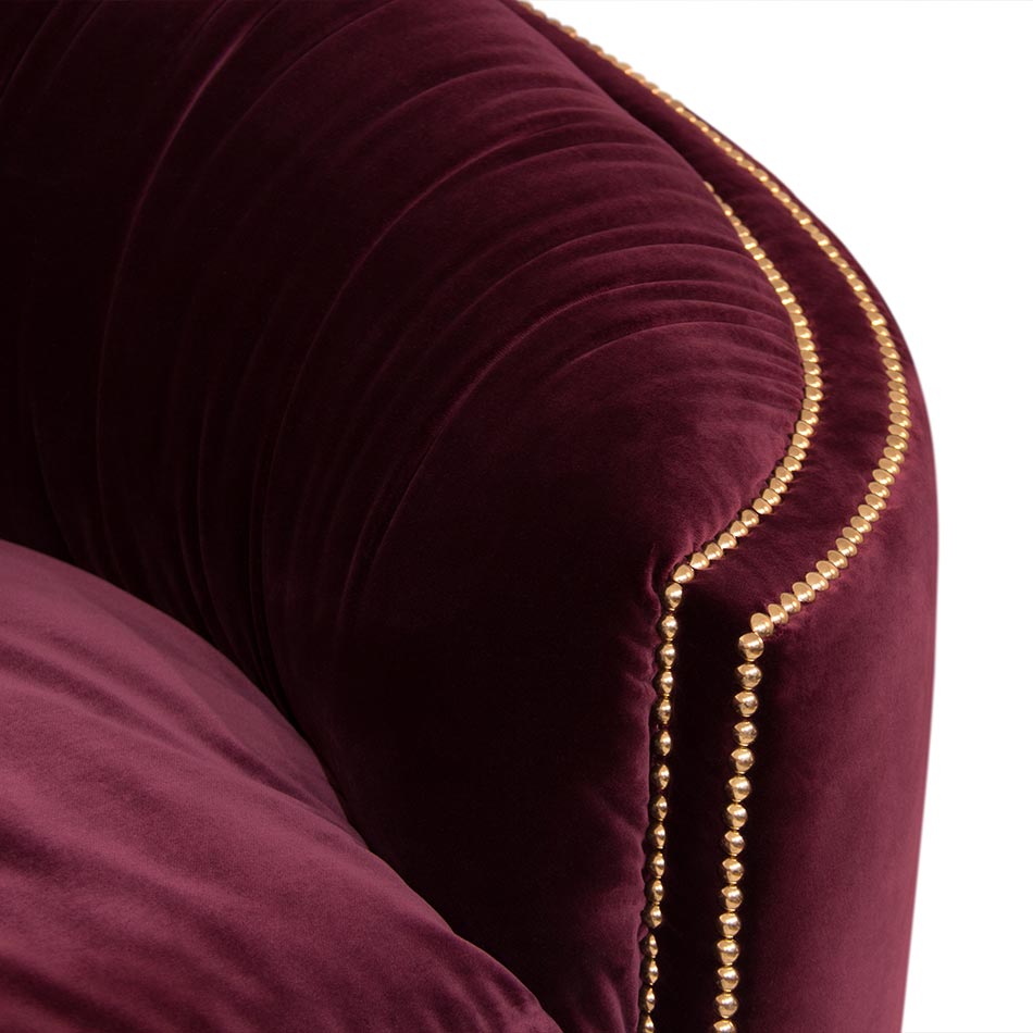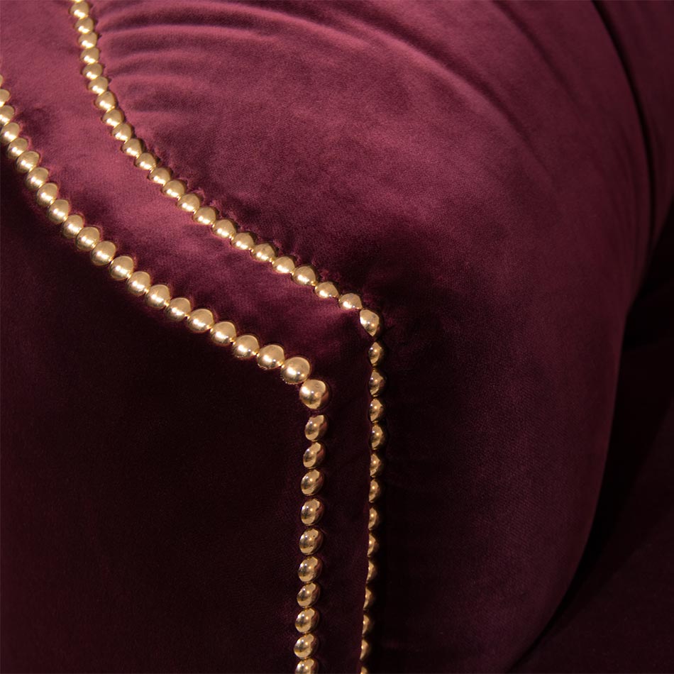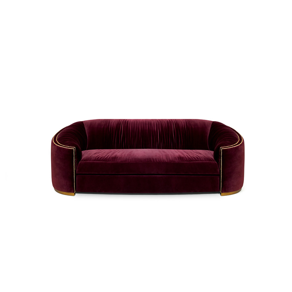 Often called the “Land of Castles”, Wales has some of the most impressive monuments of the Middle Ages. WALES Sofa pays tribute to the country’s history. Upholstered in cotton velvet and with a base in matte vintage brass, this curved velvet sofa features a golden polished nailhead trim that makes it even more elegant.